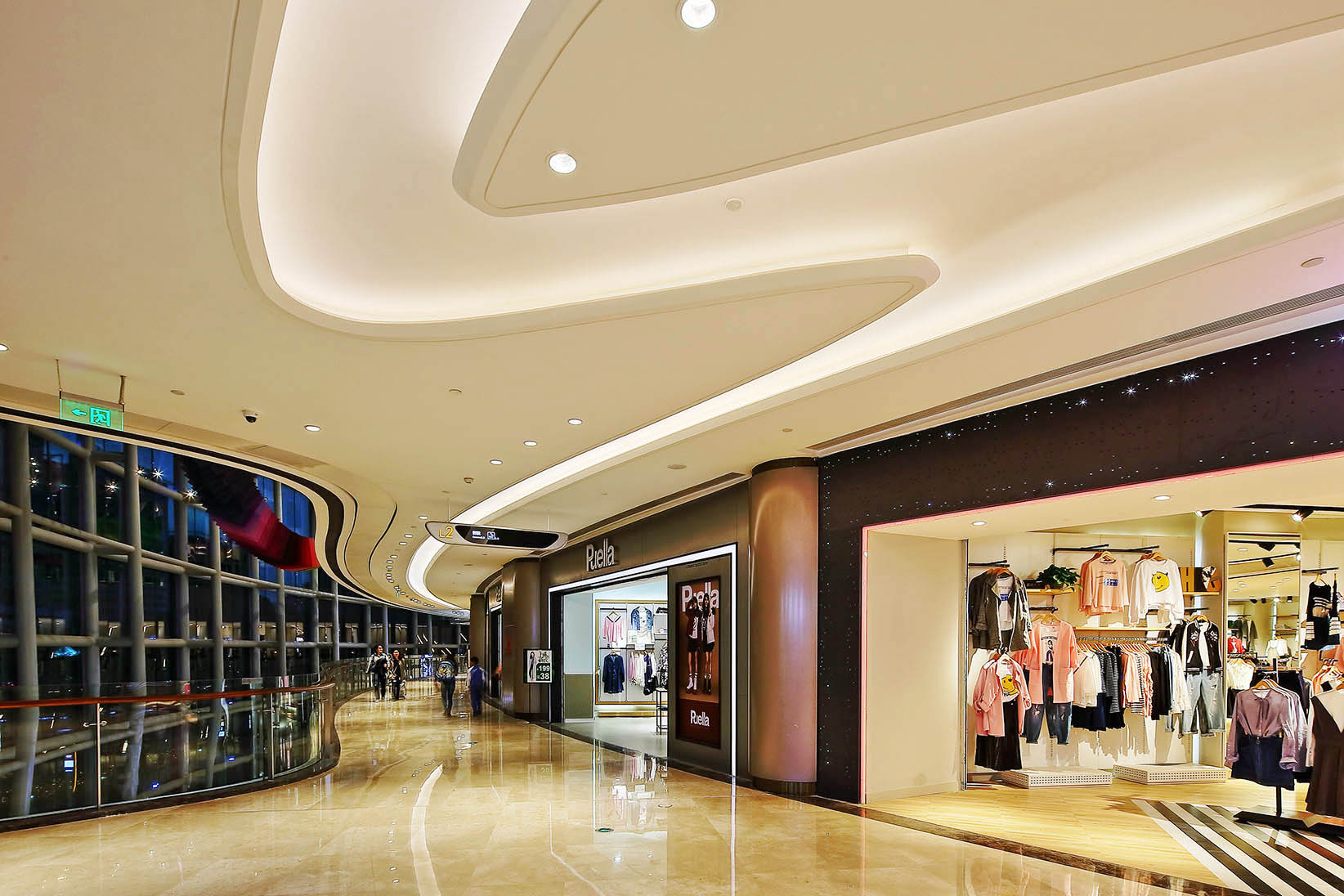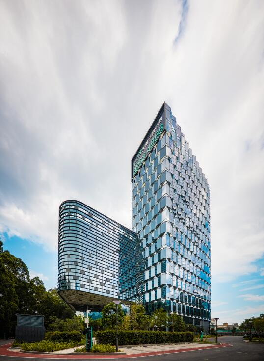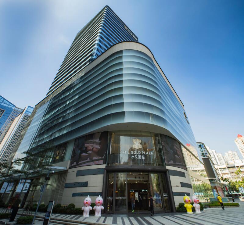 水貝金座大廈幕墻玻璃采用綜合性能較高的LOW-E中空玻璃; 3D打印彩釉,用內部燈光營造出絲綢的皺褶效果。玻璃、陶土板等面板,95%以上是在工廠加工,大大節省了現場施工時間,保障了工程的順利完工。