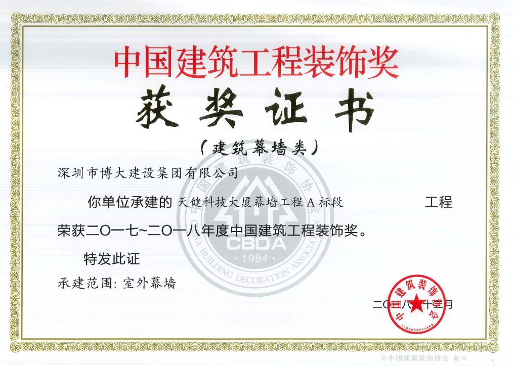 博大建設集團承建的昆明醫科大學第一附屬醫院3號樓、華遠金外灘四期君悅酒店、綠景虹灣裙樓商業公共部分、水貝金座大廈幕墻工程、天健科技大廈幕墻工程等5個經典工程以卓越品質榮獲中國建筑工程裝飾獎。