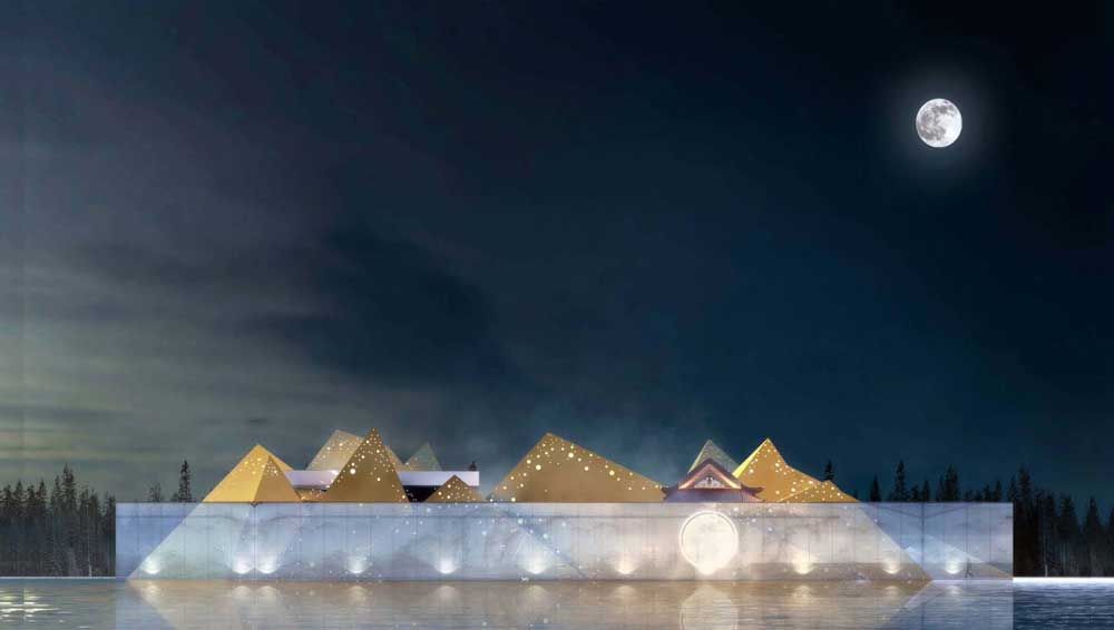 圖7為藝術展覽館。以月影為主題,形似金字塔,外墻采用古銅色鋁板密拼做法,四周外墻采用傳統的框架式玻璃幕墻。在月光下塔體倒映在玻璃外墻上形成像山脈一樣的山水畫,體現出了設計的藝術色彩。