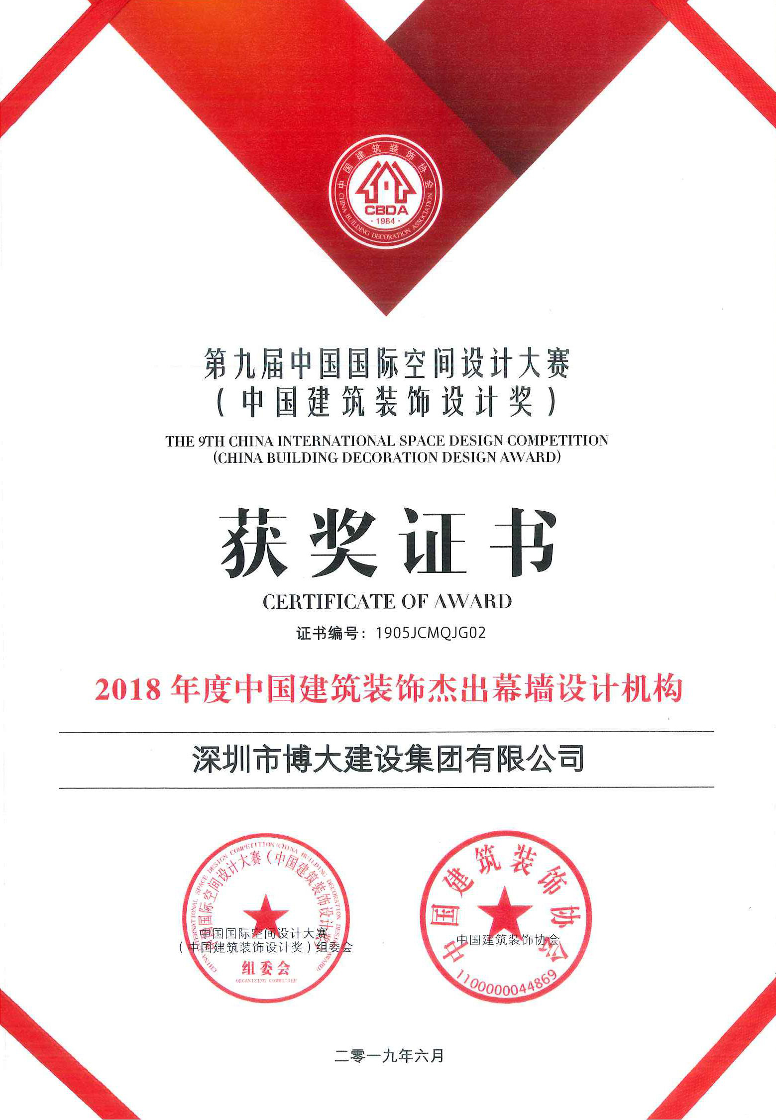 博大獲得2018年度中國建筑裝飾杰出幕墻設計機構(gòu),總裁李朕鴻榮獲商業(yè)方案類設計金獎,設計院院長方邵文榮獲娛樂空間方案類設計銀獎。